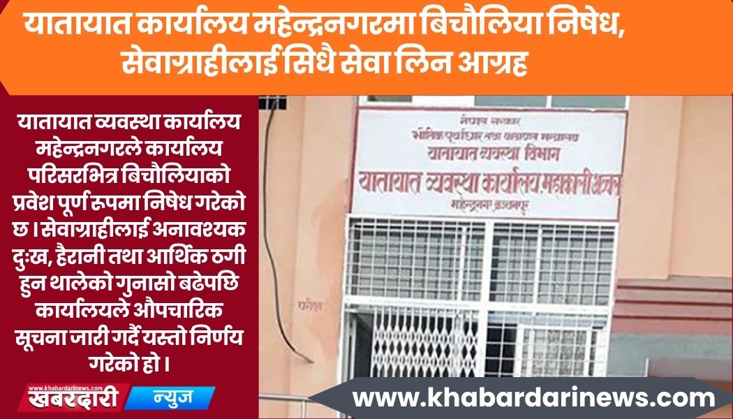 कञ्चनपुरः यातायात व्यवस्था कार्यालय महेन्द्रनगरले कार्यालय परिसरभित्र बिचौलियाको प्रवेश पूर्ण रूपमा निषेध गरेको छ ।