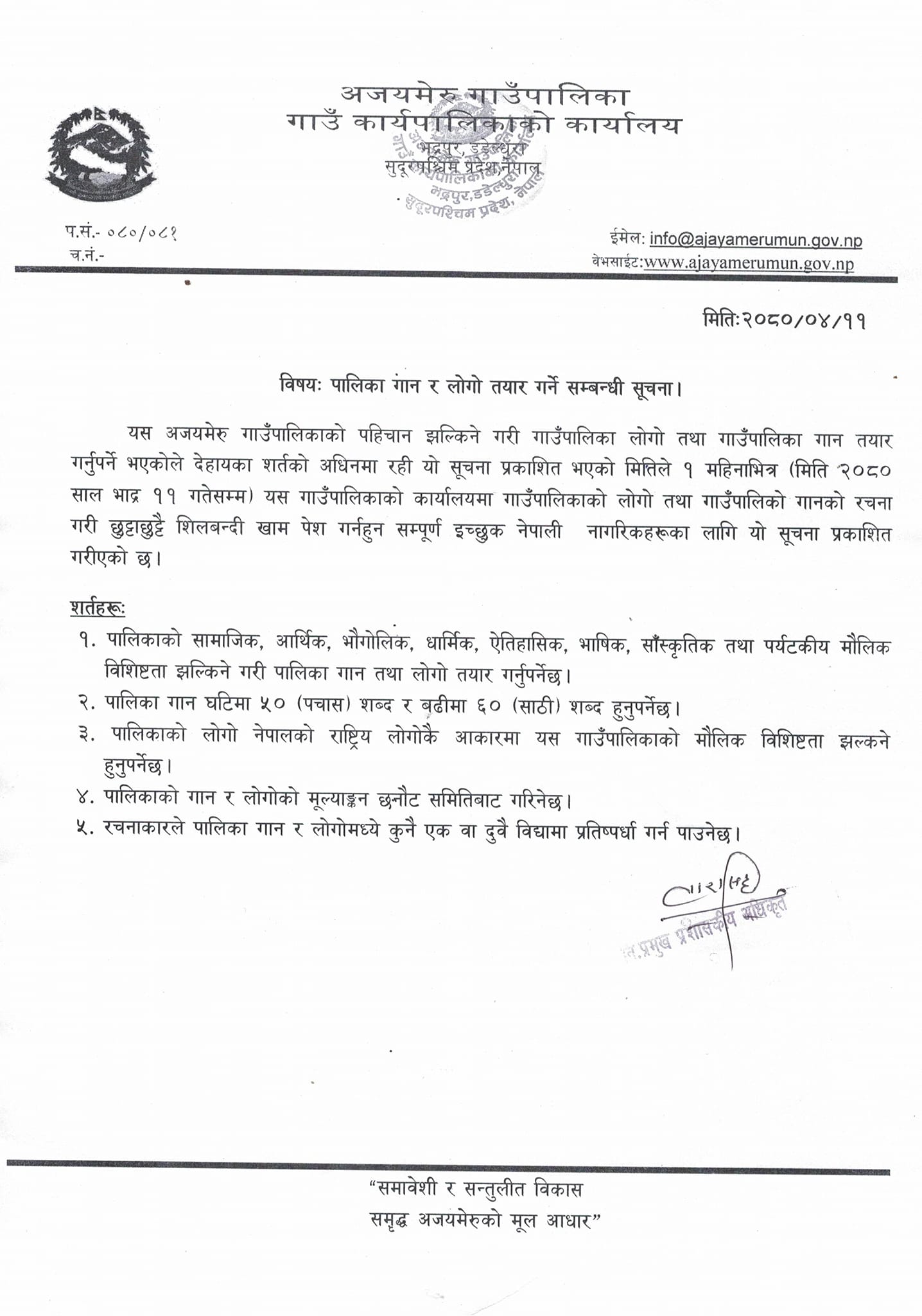 डडेल्धुराः डडेल्धुराको अजयमेरु गाउँपालिकाले आफ्नै पालिका लोगो र गान तयार गर्ने भएको छ । अजयमेरुको पहिचान झल्किने गरी गाउँपालिकाले लोगो र गान तयार गर्न लागेको पालिकाले एक सुचना माफृत जानकारि गराउकोछ ।