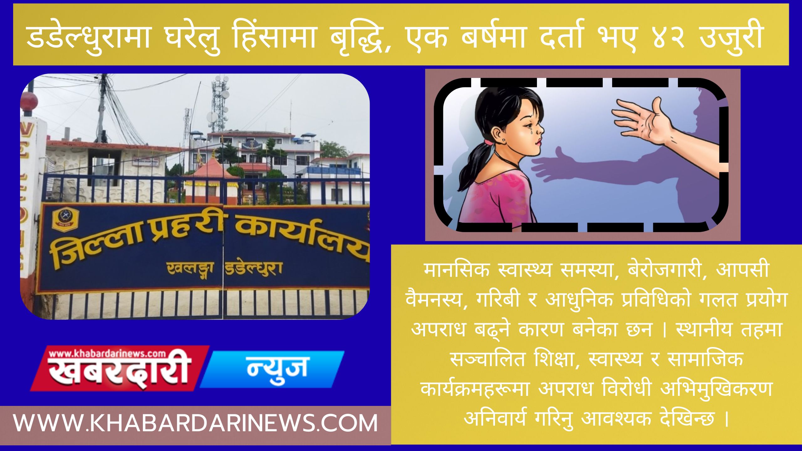 डडेल्धुराः सात पालिका रहेको डडेल्धुरा जिल्लामा आ.व २०८१।८२ मा घरेलु हिंसाका ४२ उजुरी जिल्ला प्रहरी कार्यालय डडेल्धुरामा दर्ता भएका छन् ।