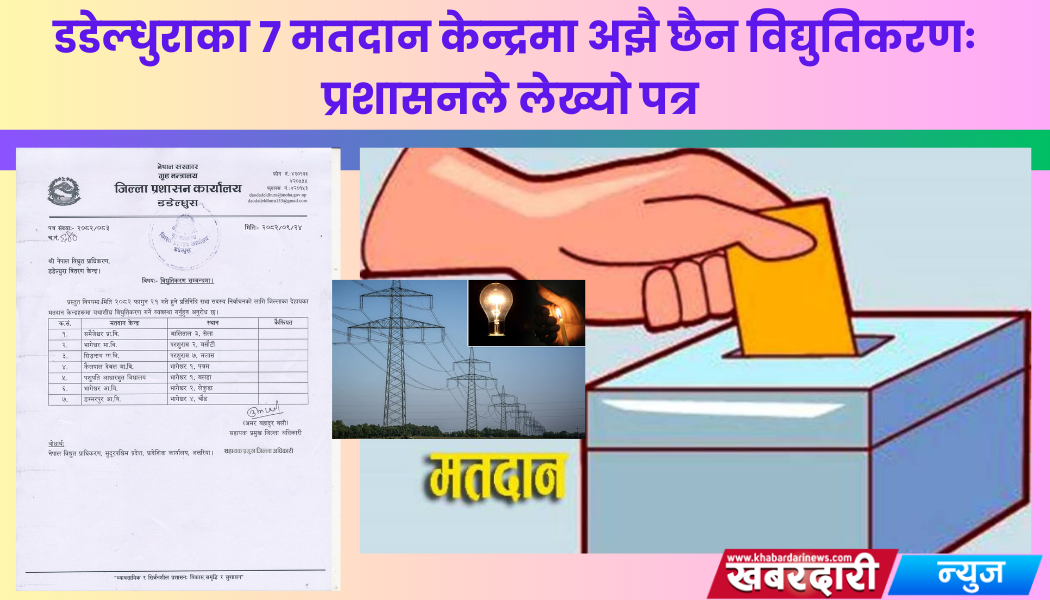 डडेल्धुराः डडेल्धुराका ७ ओटा मतदान केनद्रमा विद्युत सेवा अपुग रहेको जिल्ला प्रशासन कार्यालयले जनाएकोछ । कार्यालयले नेपाल विद्युत प्राधिरण वितरण केन्द्र डडेल्धुरालाई यी ७ केन्द्रमा विद्युत सेवा को व्यवस्था गर्नुका लागि पत्र लेखेको हो ।