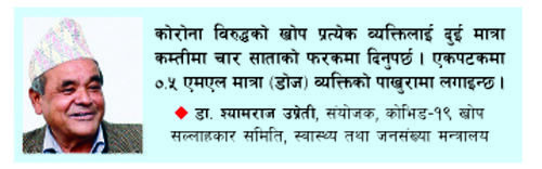 हालसालै भारतमा सेरम इन्स्टिच्युटको कोभिसिल्ड र भारत बायोटेकको कोभ्याक्स खोप प्रयोगमा आएको छ । सो खोप एक जनाले दुई डोज लगाउनुपर्नेछ । पहिलो चरणमा ५ लाख नागरिकलाई खोप उपलब्ध गराइनेछ । नेपालको कुल जनसंख्याको ७२ प्रतिशत नागरिकलाई खोप उपलब्ध गराउनेछ । कानुनी, प्रशाशनिक, आर्थिक र प्राविधिक समस्या हल भइसकेको र खोप लगाउन सम्पूर्ण तयारी सम्पन्न भएको छ ।