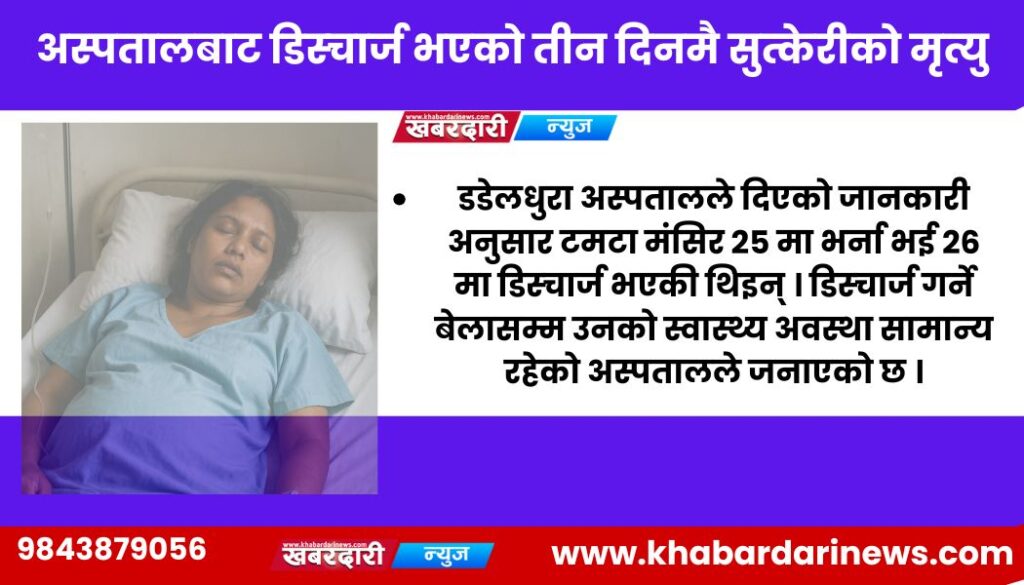 डडेल्धुरा — डडेल्धुराको अमरगढी नगरपालिका–६ की ३५ वर्षीया सुत्केरी मुना टमटाको अस्पतालबाट डिस्चार्ज भएको तीन दिनामै मृत्यु भएको छ । मंसिर २५ मा डडेल्धुरा अस्पतालमा